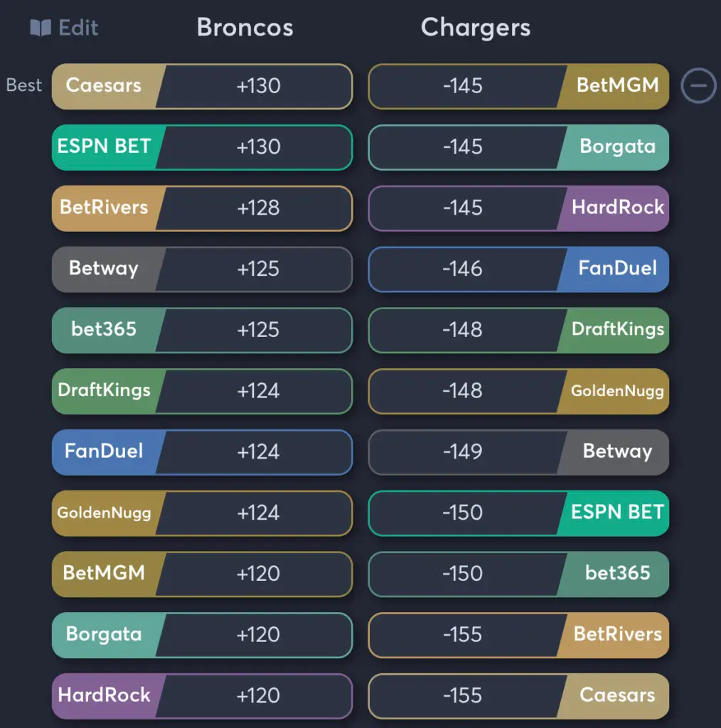 Get the best odds for the Denver Broncos vs Los Angeles Chargers game today. With Juice Reel, your go-to sports betting tool for comprehensive betting insights, we dive into the best odds across 300+ sportsbooks to ensure you are getting the most value for your bets.