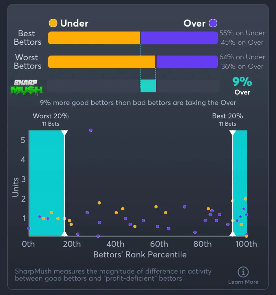 SharpMush™ highlights the difference in betting behavior between sharp (high-performing) and mush (low-performing) bettors. It shows where sharp bettors are siding more heavily than bad bettors, helping users identify betting angles with potential value—or traps to avoid.
