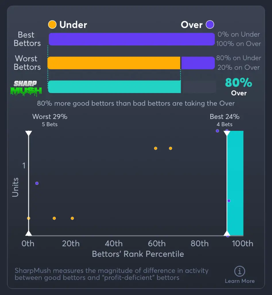 SharpMush™ highlights the difference in betting behavior between sharp (high-performing) and mush (low-performing) bettors. It shows where sharp bettors are siding more heavily than bad bettors, helping users identify betting angles with potential value—or traps to avoid.