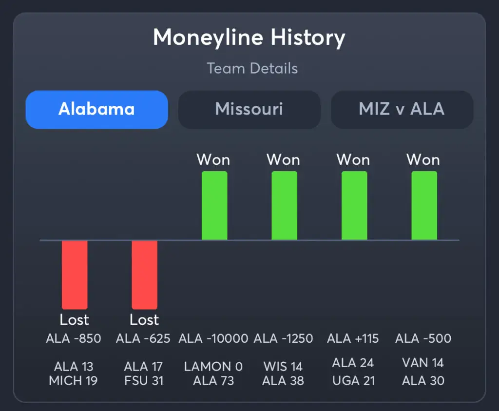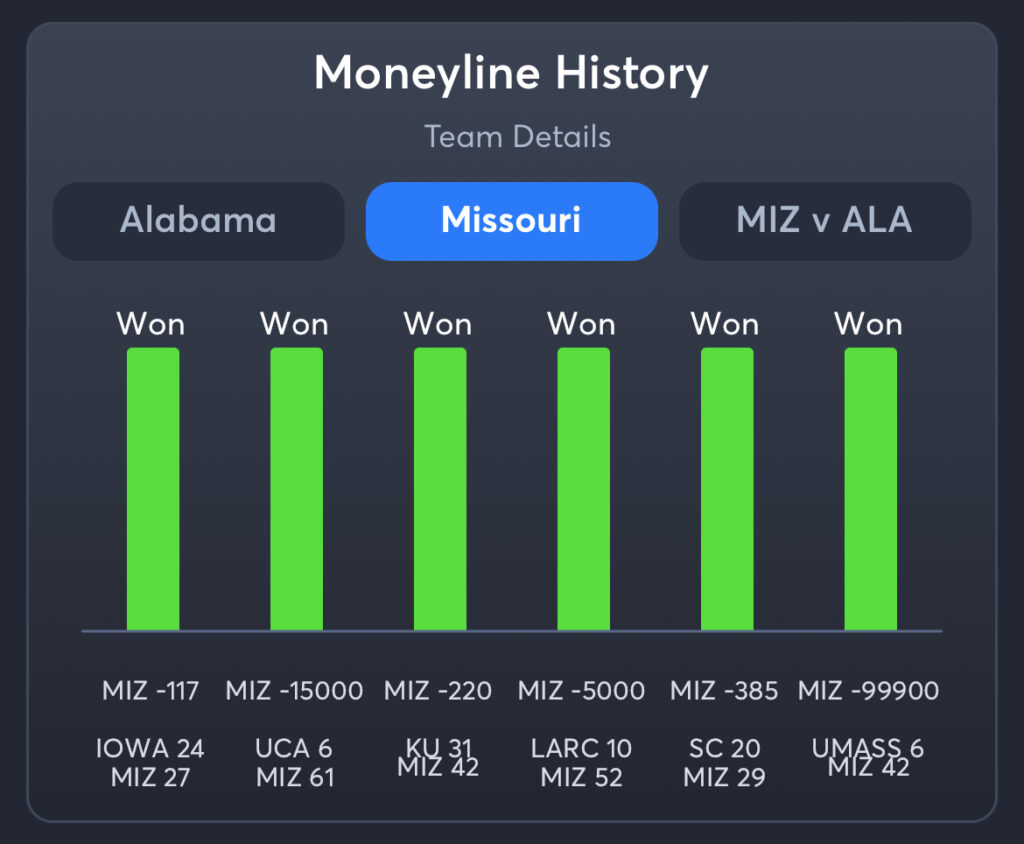Below is the moneyline history for the Alabama vs Missouri matchup. The Alabama Crimson Tide have won 4 out of their last 6 games outright while the Missouri Tigers have won 6 of their last 6 games.