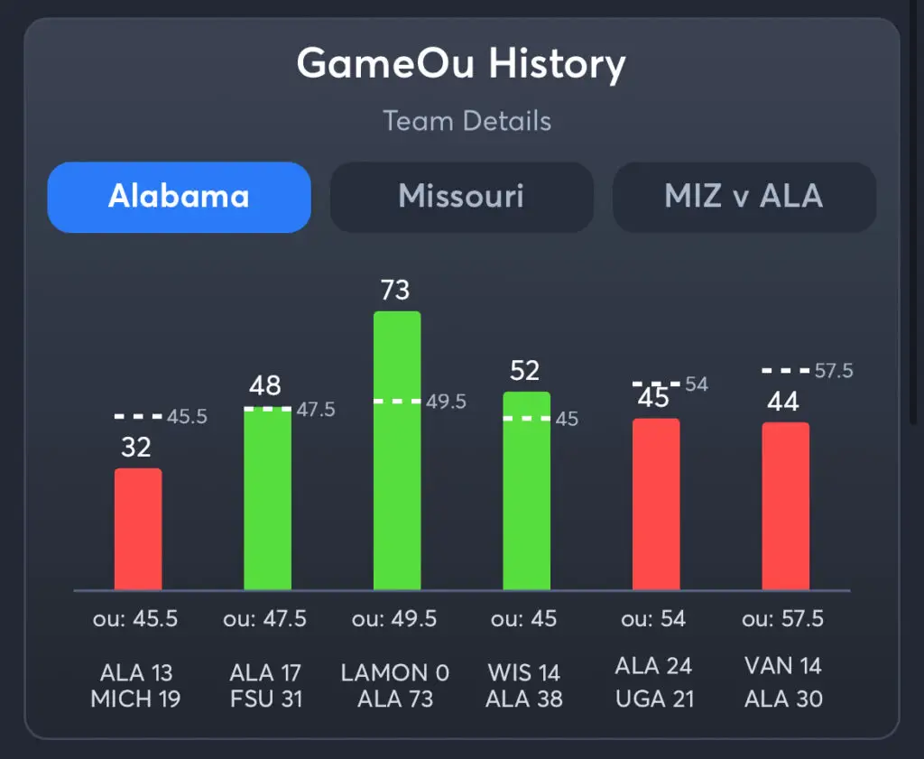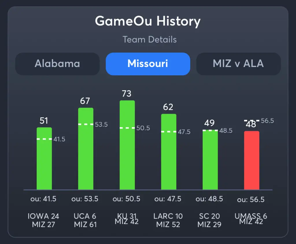 Below is the total history for the Alabama vs Missouri pick. The total for Alabama has gone over 3 of their last 6 games while the total for Missouri has gone over for 5 out of the last 6 games.