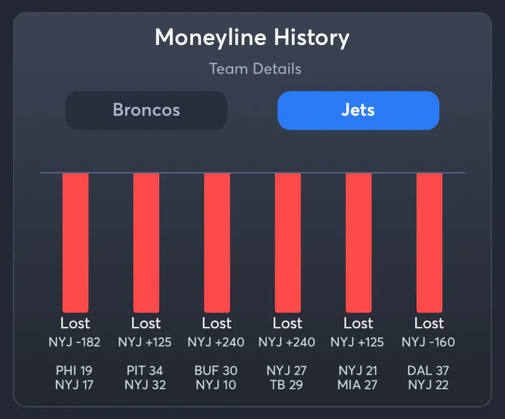Below is the moneyline history for the Broncos vs Jets matchup. The Denver Broncos have won 4 out of their last 6 games outright while the New York Jets have lost 6 straight games.
