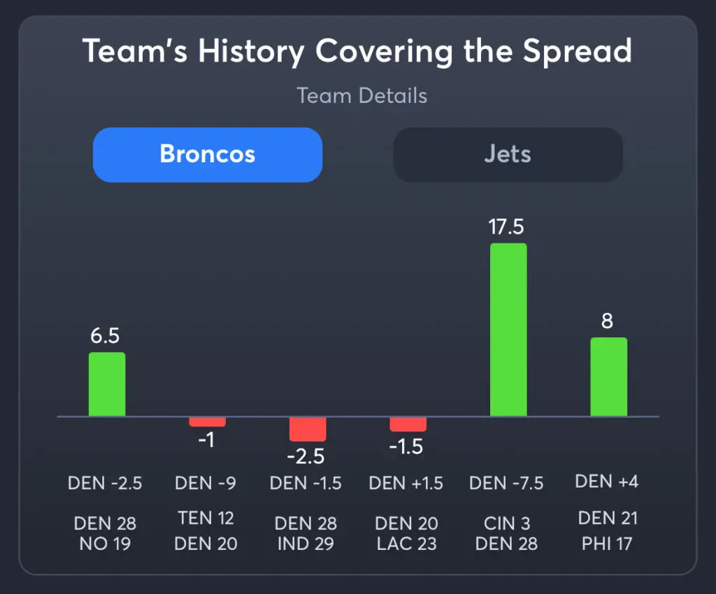Below is the spread history for the Broncos vs Jets pick. The Broncos have covered the spread in 3 out of their last 6 games while the Jets have covered in 2 of the last 6 games.Â
