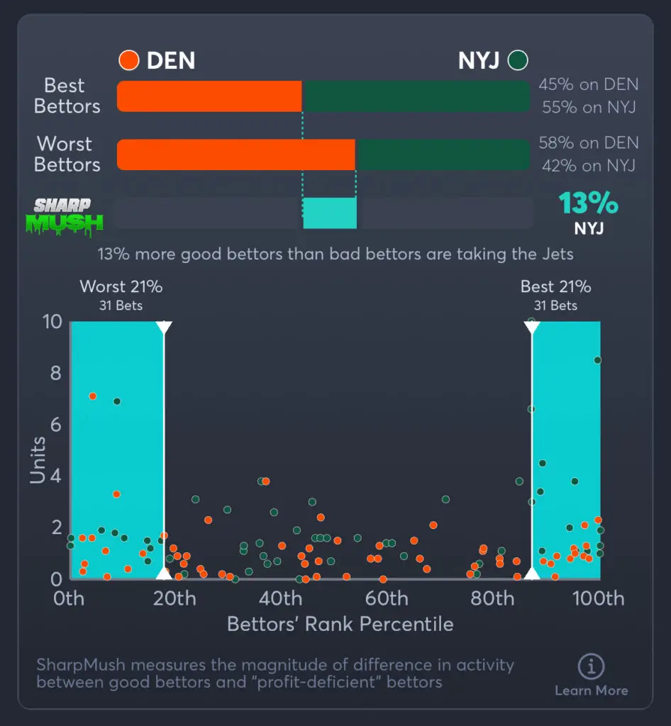 SharpMush™ highlights the difference in betting behavior between sharp (high-performing) and mush (low-performing) bettors. It shows where sharp bettors are siding more heavily than bad bettors, helping users identify betting angles with potential value—or traps to avoid.