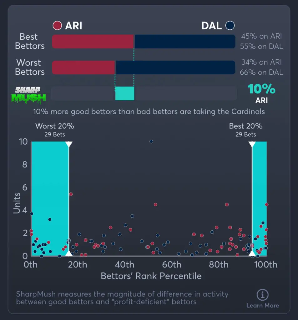 SharpMush™ highlights the difference in betting behavior between sharp (high-performing) and mush (low-performing) bettors. It shows where sharp bettors are siding more heavily than bad bettors, helping users identify betting angles with potential value—or traps to avoid.