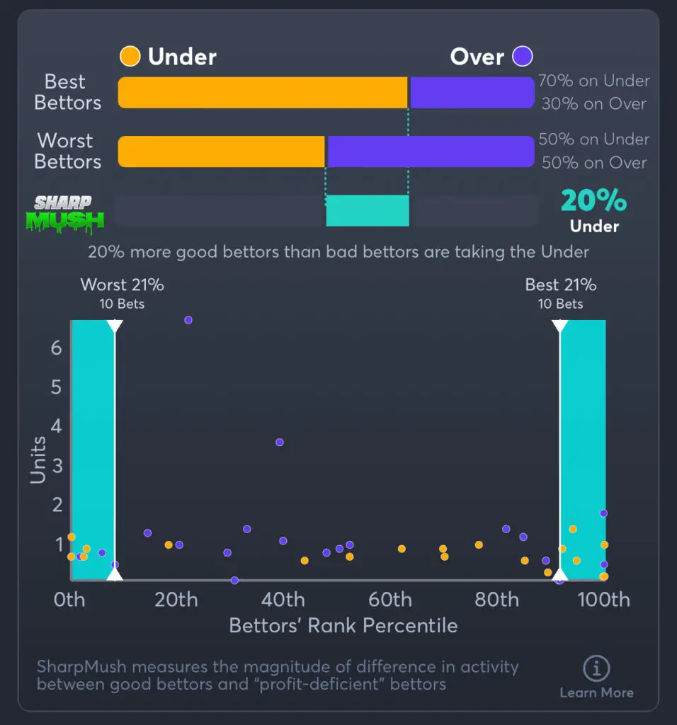 SharpMush™ highlights the difference in betting behavior between sharp (high-performing) and mush (low-performing) bettors. It shows where sharp bettors are siding more heavily than bad bettors, helping users identify betting angles with potential value—or traps to avoid.