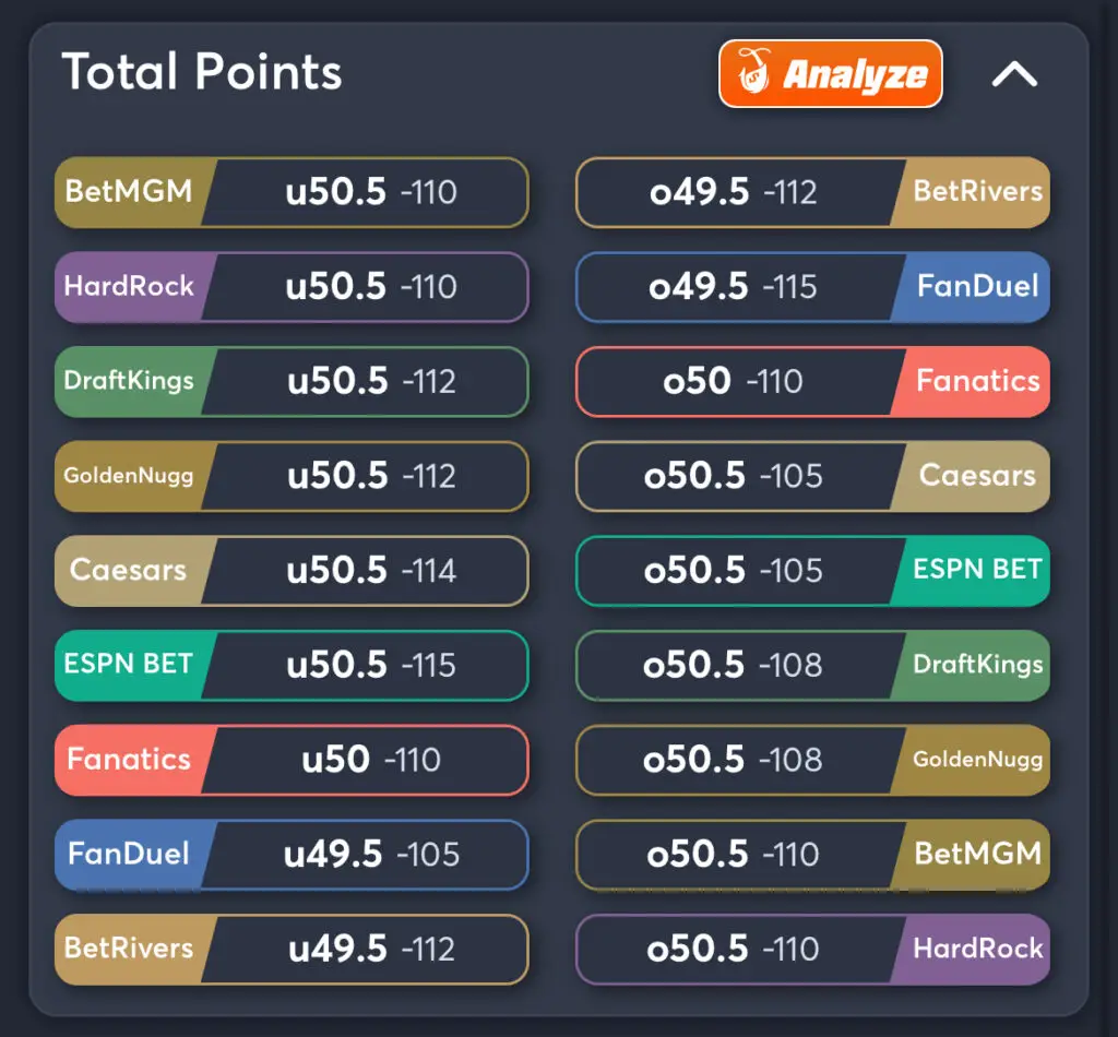 Get the best odds for the under with BetMGM as they are offering under 50.5 and over 49.5 with BetRivers.