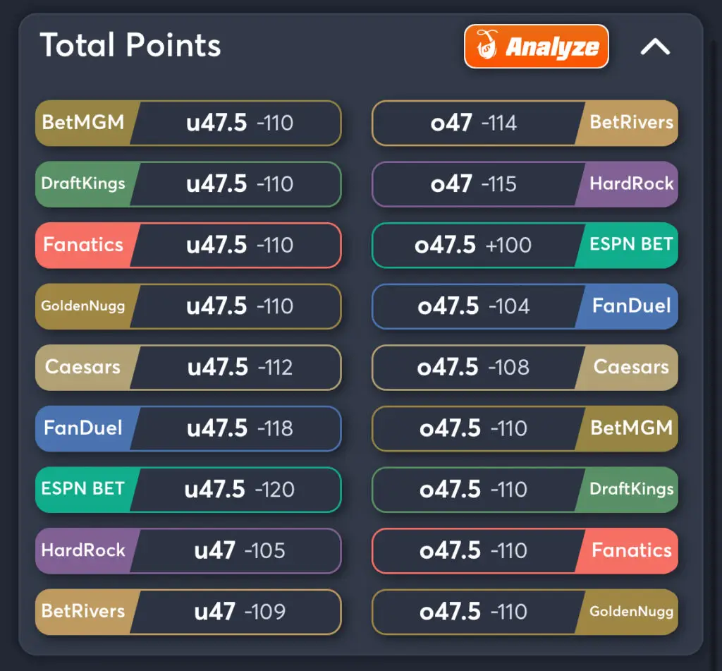 Get the best odds for the under with BetMGM as they are offering under 47.5 and over 47.0 with BetRivers.