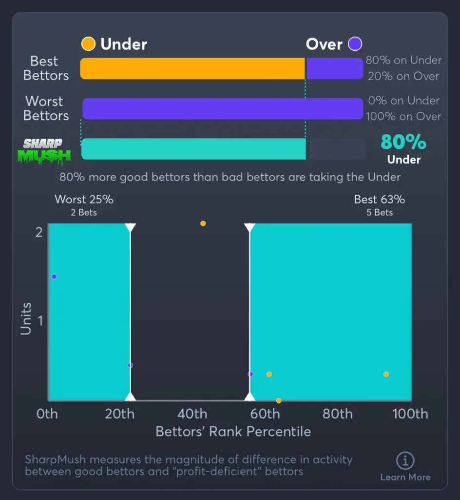 SharpMush™ highlights the difference in betting behavior between sharp (high-performing) and mush (low-performing) bettors. It shows where sharp bettors are siding more heavily than bad bettors, helping users identify betting angles with potential value—or traps to avoid.