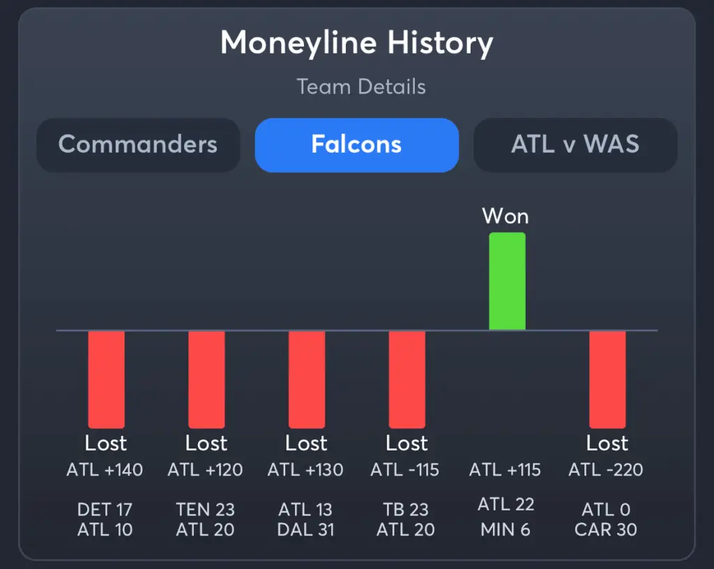Below is the moneyline history for the Commanders vs Falcons matchup. The Washington Commanders have won 2 out of their last 6 games outright while the Atlanta Falcons have won 1 of their last 6 games.
