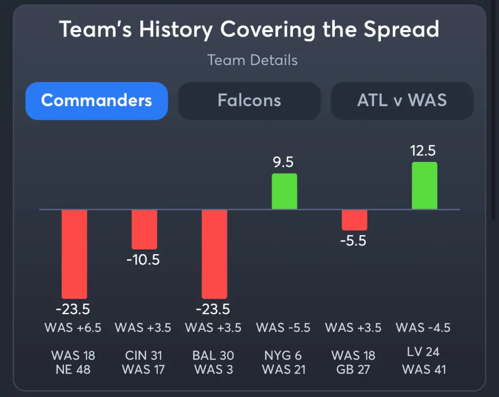 Below is the spread history for the Commanders vs Falcons pick. The Commanders have covered the spread in 2 out of their last 6 games while the Falcons have covered in 1 of the last 6 games.