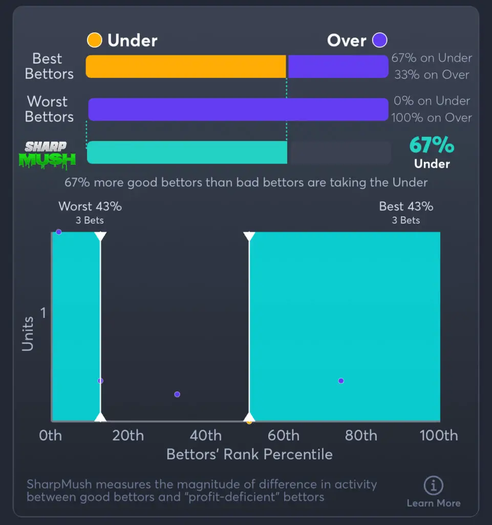 SharpMush™ highlights the difference in betting behavior between sharp (high-performing) and mush (low-performing) bettors. It shows where sharp bettors are siding more heavily than bad bettors, helping users identify betting angles with potential value—or traps to avoid.