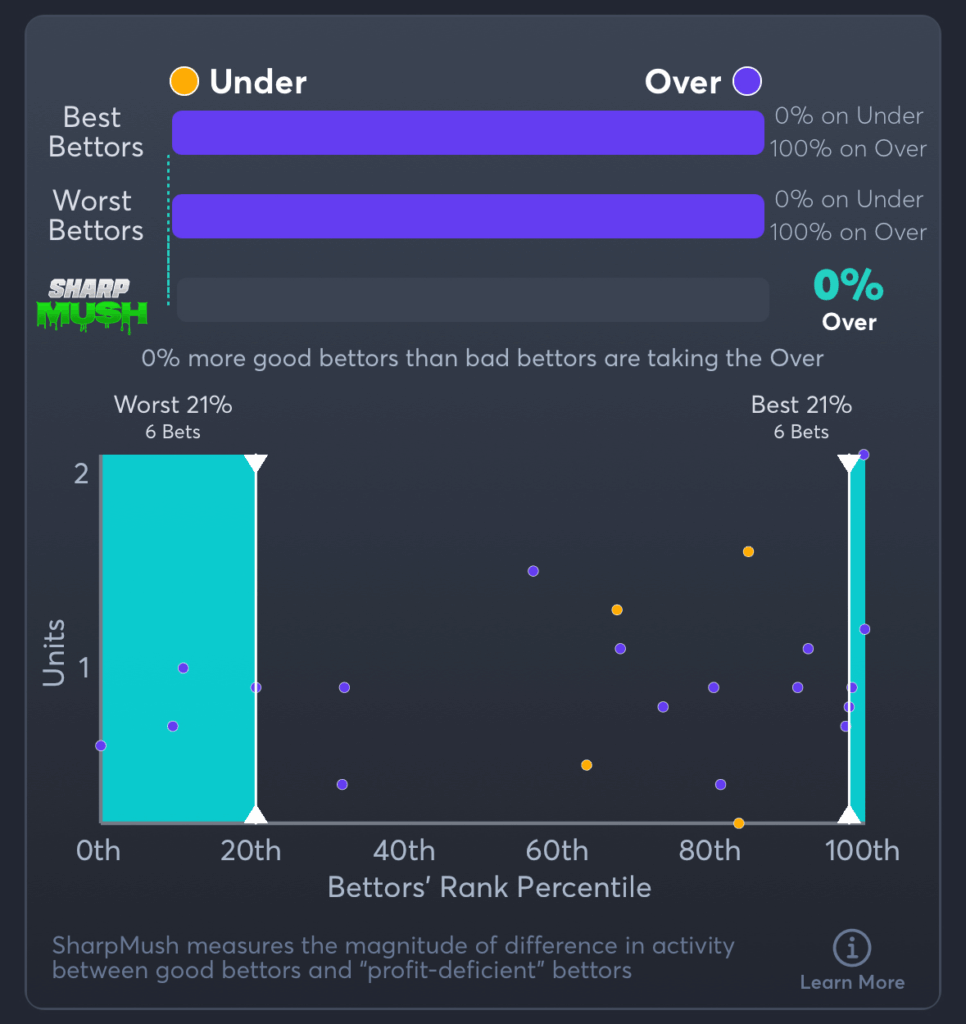 SharpMush™ highlights the difference in betting behavior between sharp (high-performing) and mush (low-performing) bettors. It shows where sharp bettors are siding more heavily than bad bettors, helping users identify betting angles with potential value—or traps to avoid.