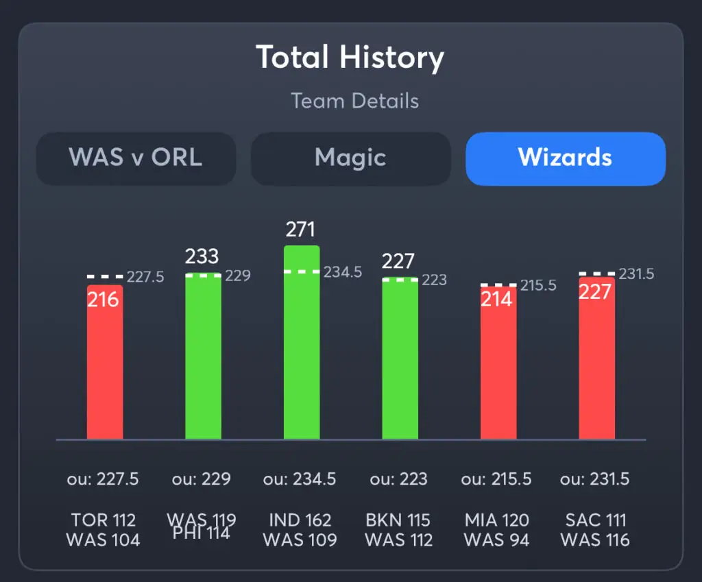 Below is the moneyline history for the Magic vs Wizards prediction.