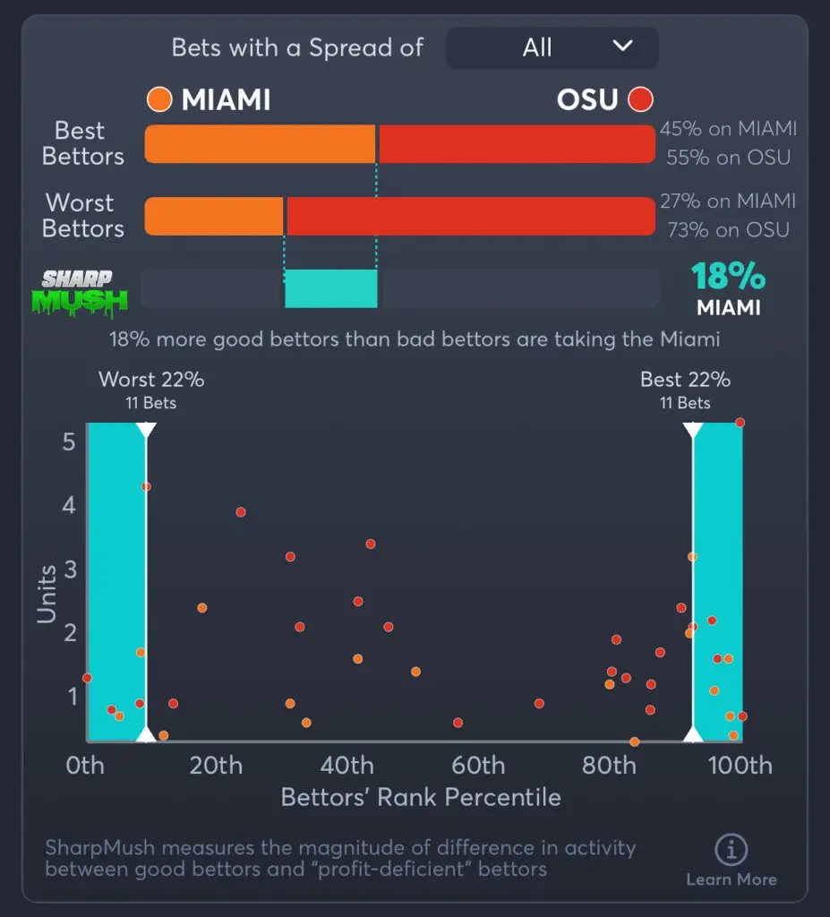 SharpMush™ highlights the difference in betting behavior between sharp (high-performing) and mush (low-performing) bettors. It shows where sharp bettors are siding more heavily than bad bettors, helping users identify betting angles with potential value—or traps to avoid.