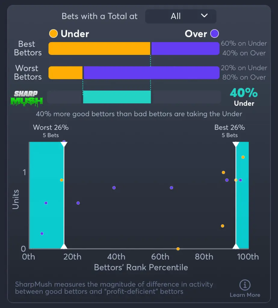 SharpMush™ highlights the difference in betting behavior between sharp (high-performing) and mush (low-performing) bettors. It shows where sharp bettors are siding more heavily than bad bettors, helping users identify betting angles with potential value—or traps to avoid.