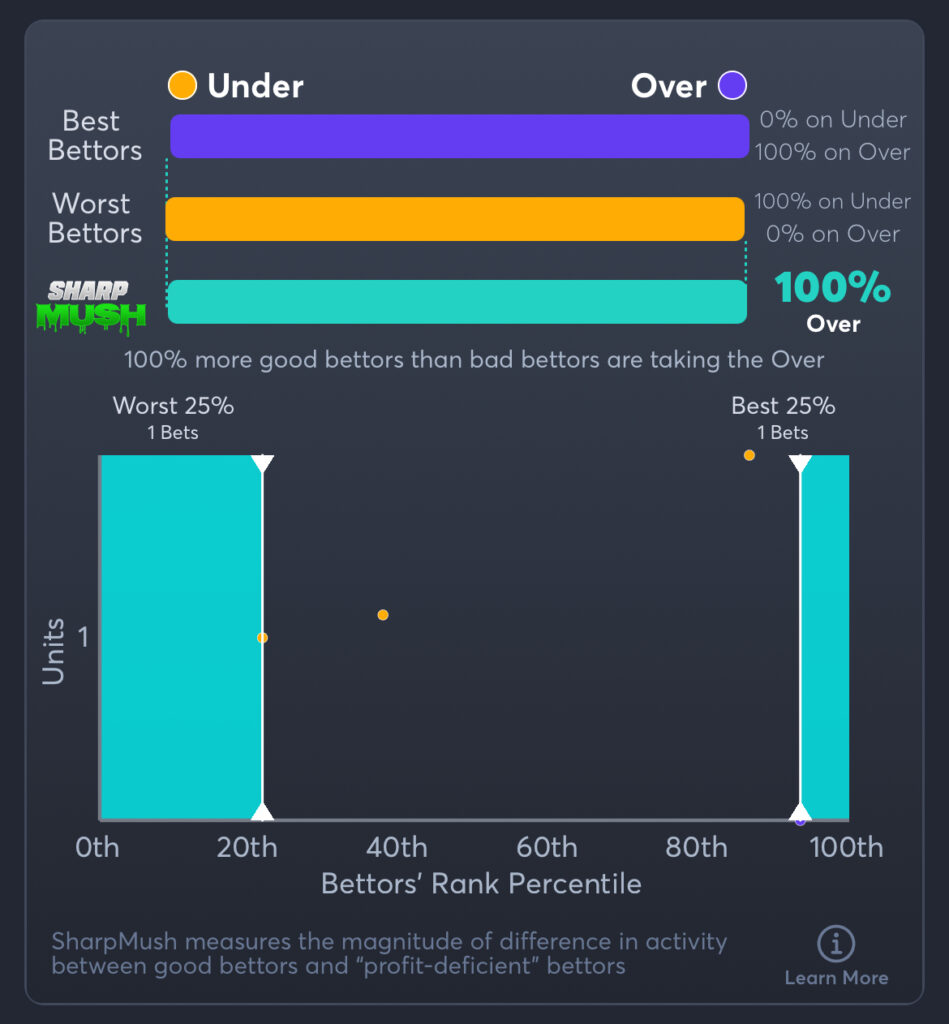 SharpMush™ highlights the difference in betting behavior between sharp (high-performing) and mush (low-performing) bettors. It shows where sharp bettors are siding more heavily than bad bettors, helping users identify betting angles with potential value—or traps to avoid.