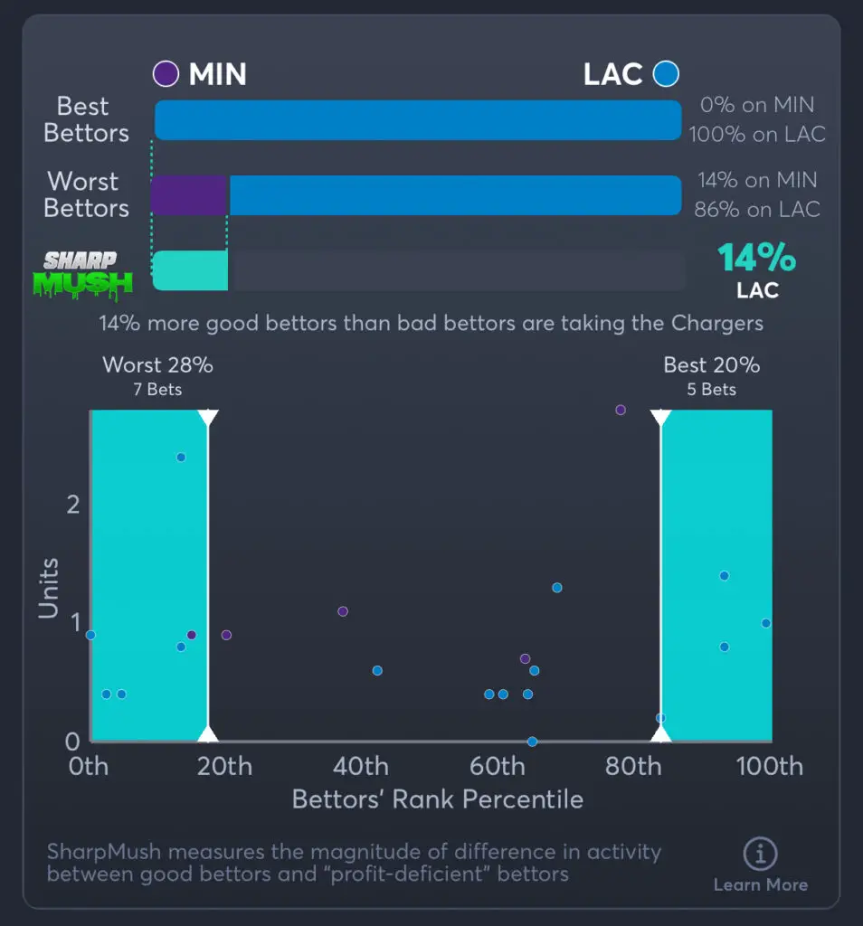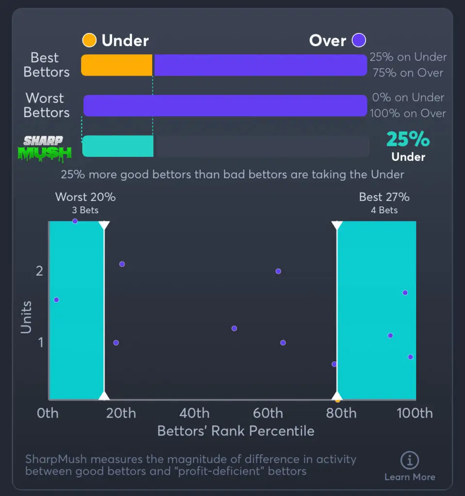 SharpMush™ highlights the difference in betting behavior between sharp (high-performing) and mush (low-performing) bettors. It shows where sharp bettors are siding more heavily than bad bettors, helping users identify betting angles with potential value—or traps to avoid.