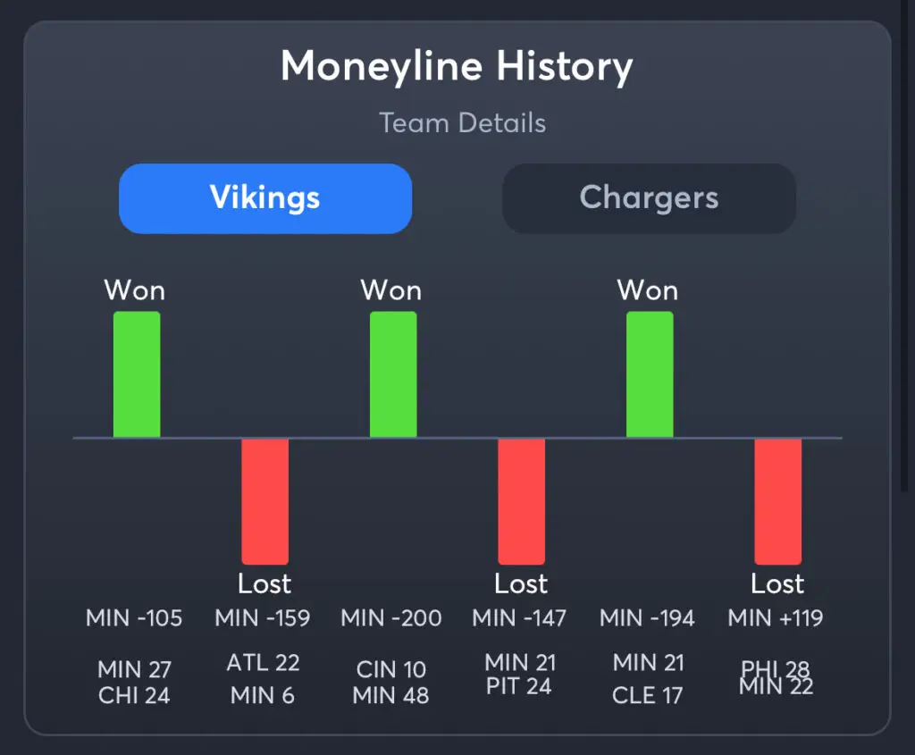 Below is the moneyline history for the Vikings vs Chargers matchup. The Minnesota Vikings have won 3 out of their last 6 games outright while the Los Angeles Chargers have won 3 out out of their last 6 games.