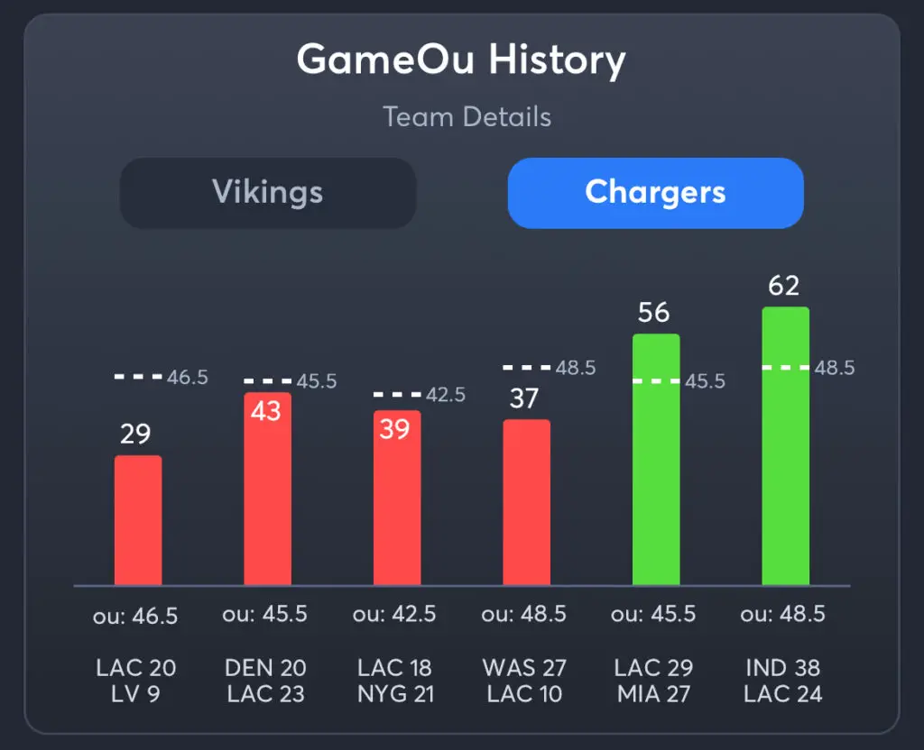 Below is the total history for the Vikings vs Chargers pick. The total for the Vikings has gone over 5 times of their last 6 games while the total for the Chargers has gone over for 2 out of the last 6 games.