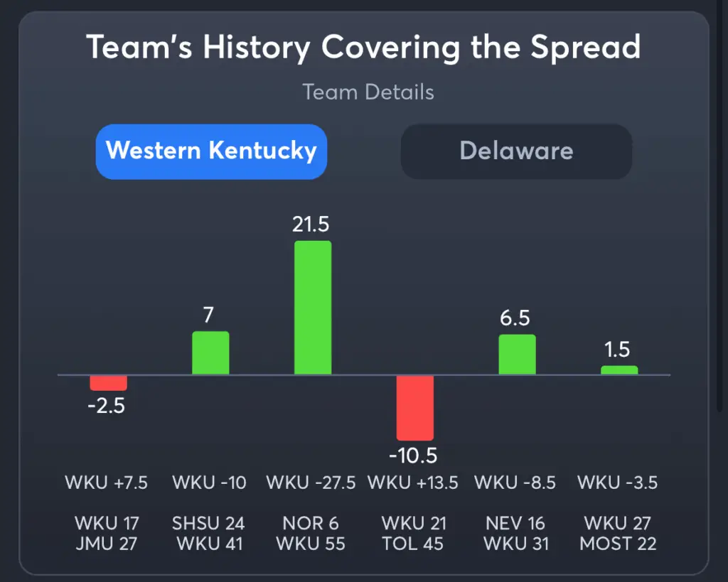 Below is the spread history for the WKU vs Delaware pick. The Hilltoppers have covered the spread in 4 out of their last 6 games while the Blue Hens have covered in 2 of the last 4 games.