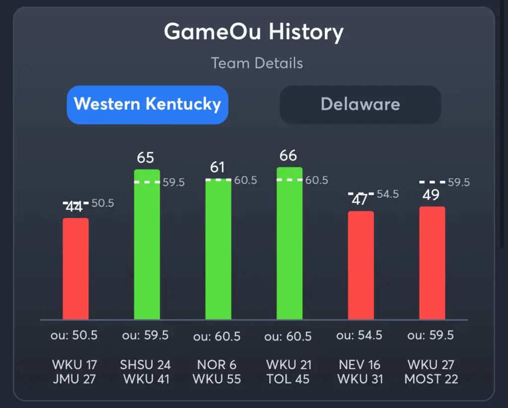 Below is the total history for the WKU vs Delaware pick. The total for the Hilltoppers has gone over 3 of their last 6 games while the total for the Blue Hens has gone over for 1 out of the last 4 games.