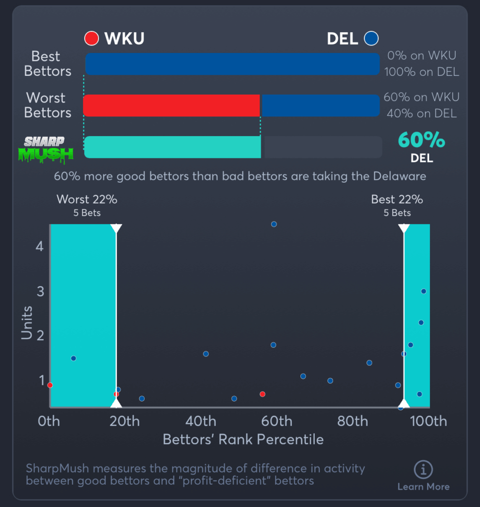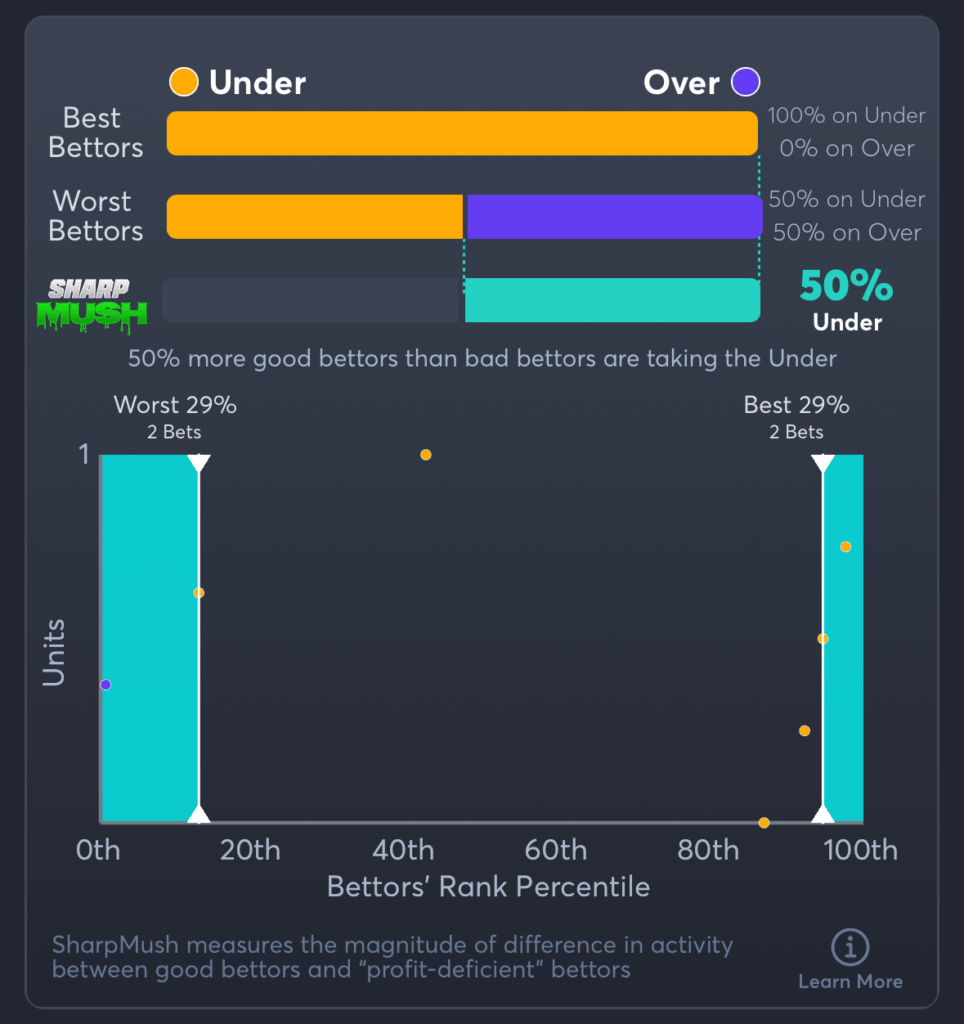 SharpMush™ highlights the difference in betting behavior between sharp (high-performing) and mush (low-performing) bettors. It shows where sharp bettors are siding more heavily than bad bettors, helping users identify betting angles with potential value—or traps to avoid.