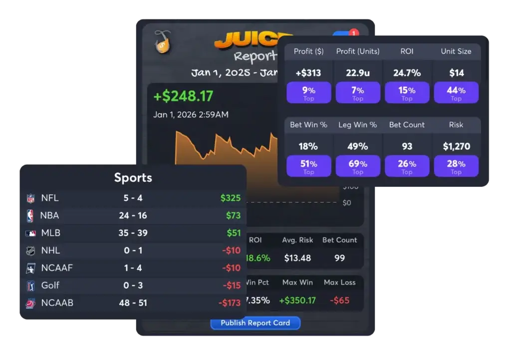 Track your bets alongside friends, top bettors, and the Juice Reel community.