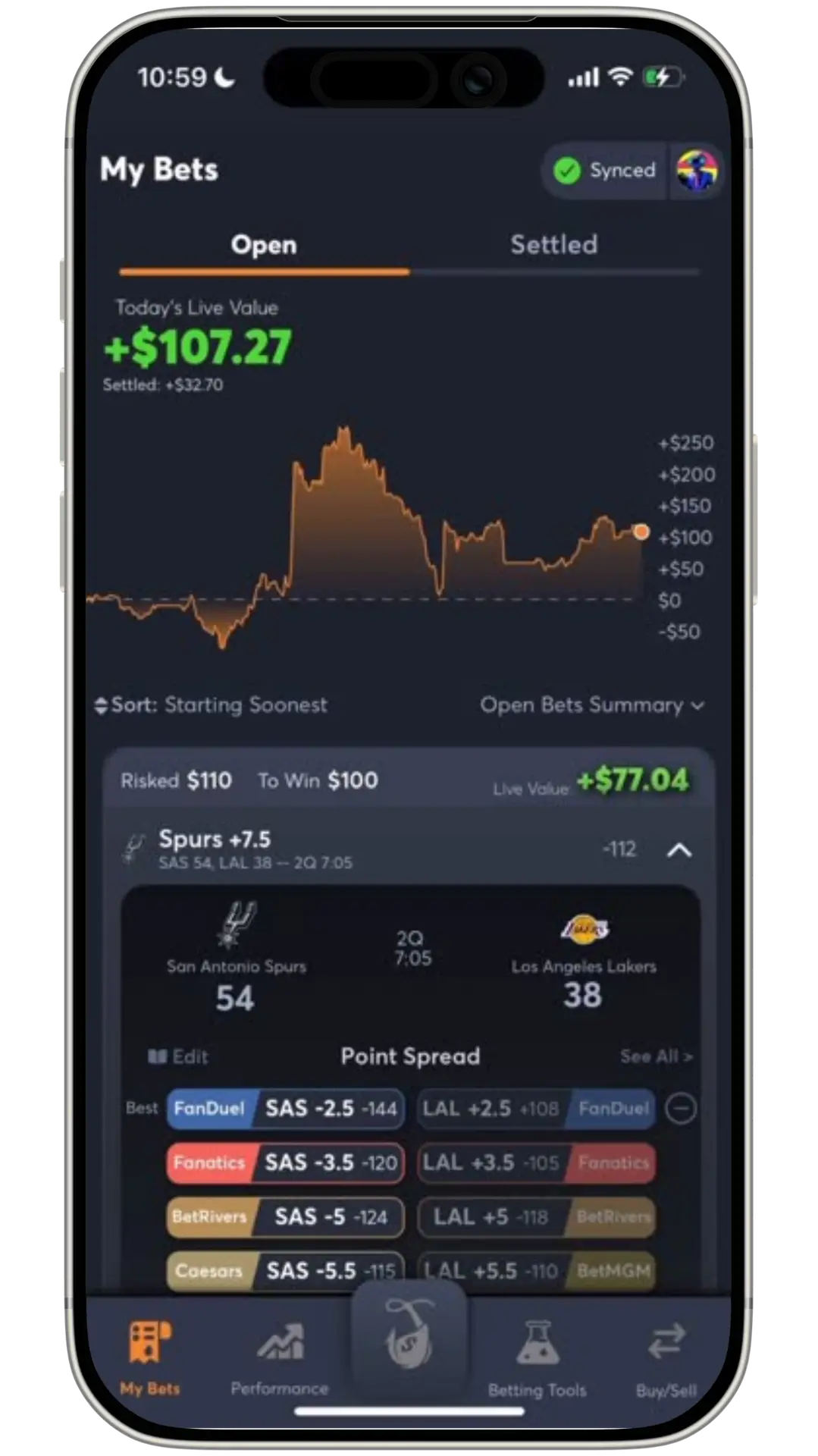 Sync bets instantly and track wins, losses, and live bets in real time — no spreadsheets required.